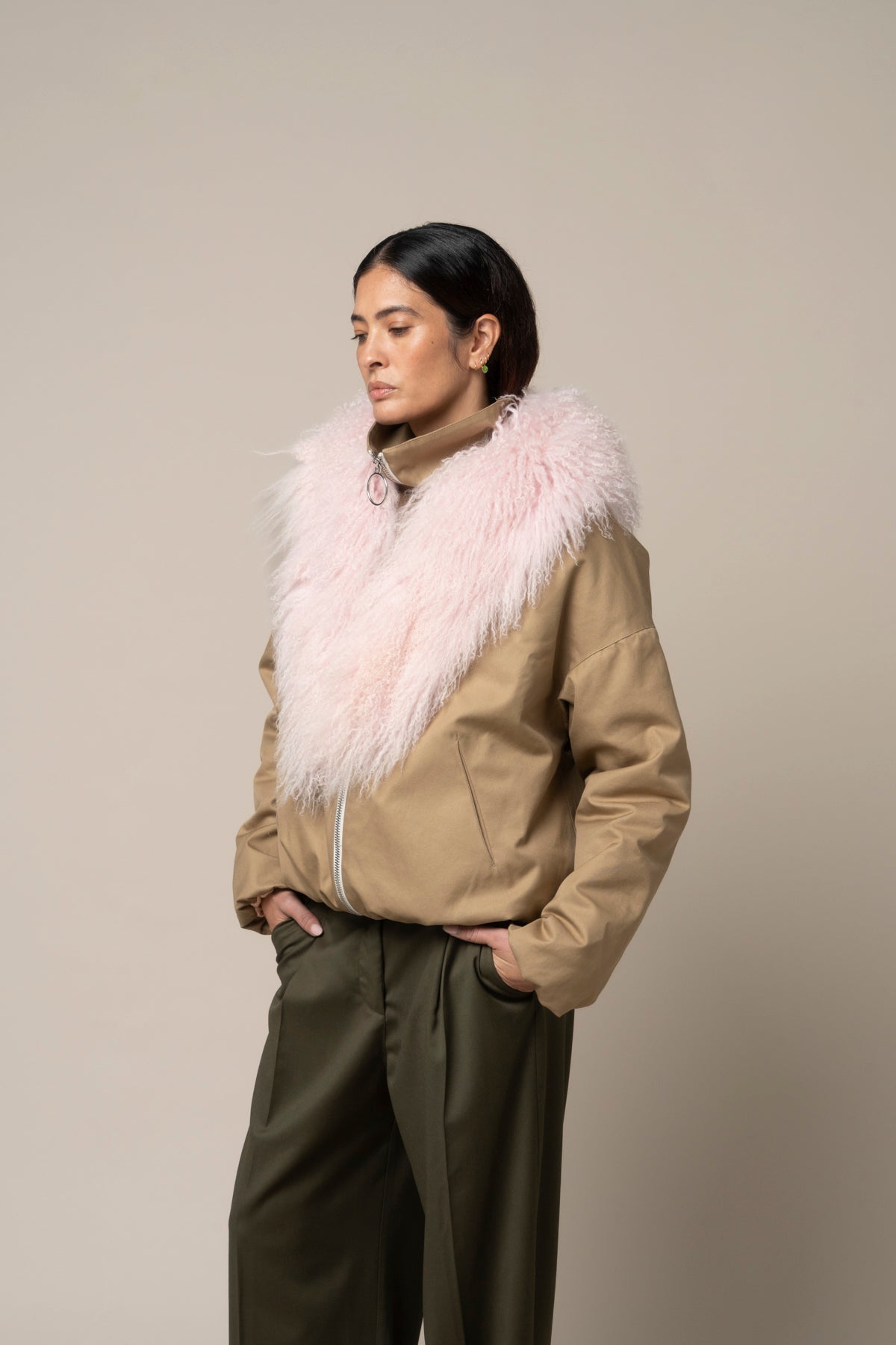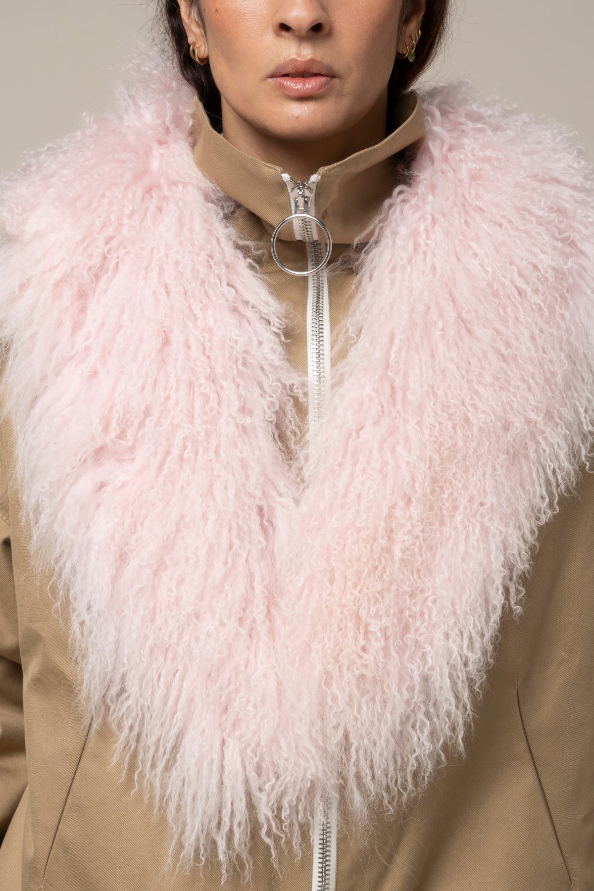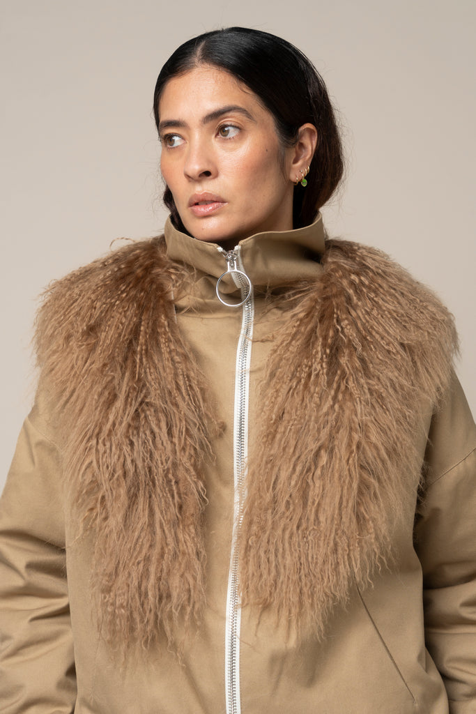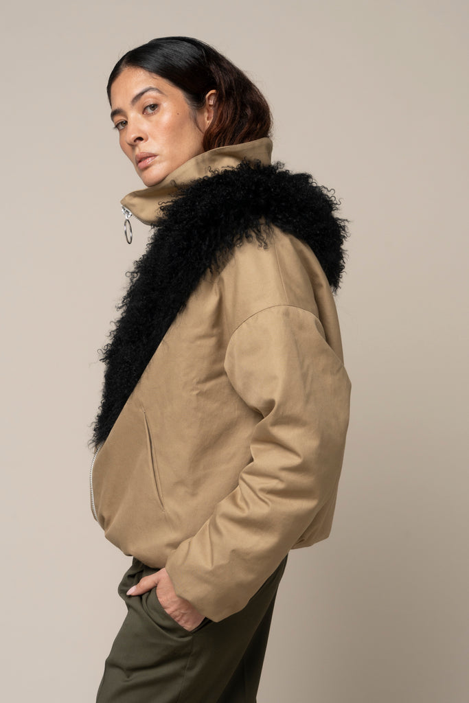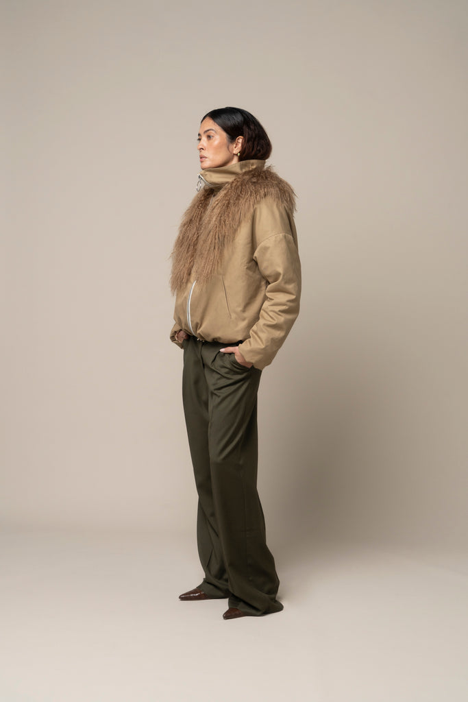 - Main fabric: 100% real mongolian lamb fur which comes from food industry waste. All the leftovers have been collected, regenerated and sewn together by italian artisans in order to give them new life supporting circular and recycle economy. Any imperfection makes your jacket unique.