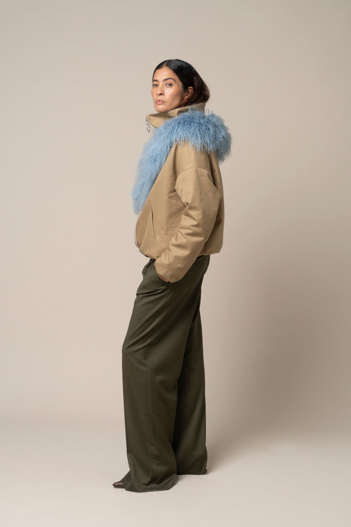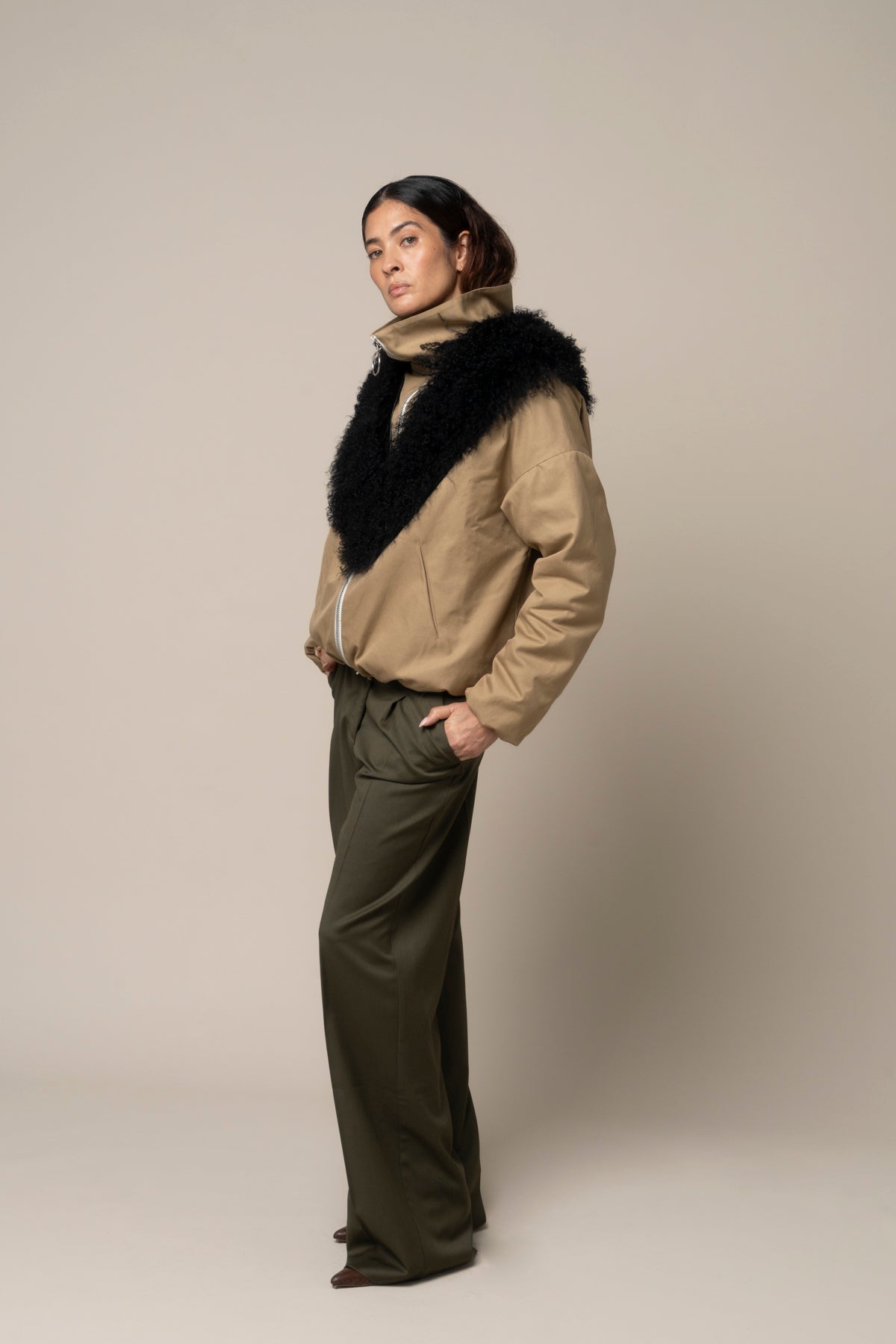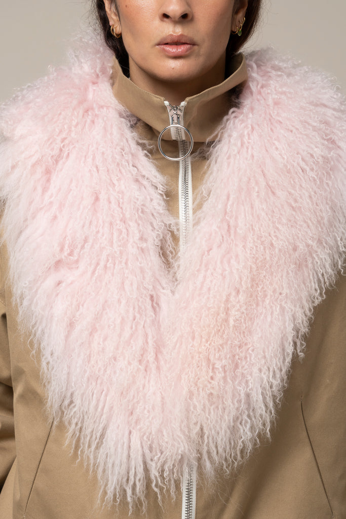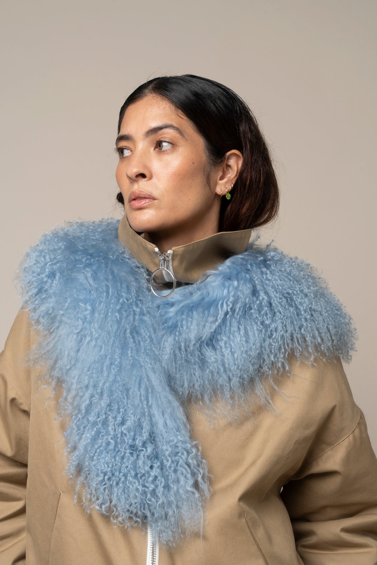 - Main fabric: 100% real mongolian lamb fur which comes from food industry waste. All the leftovers have been collected, regenerated and sewn together by italian artisans in order to give them new life supporting circular and recycle economy. Any imperfection makes your jacket unique.